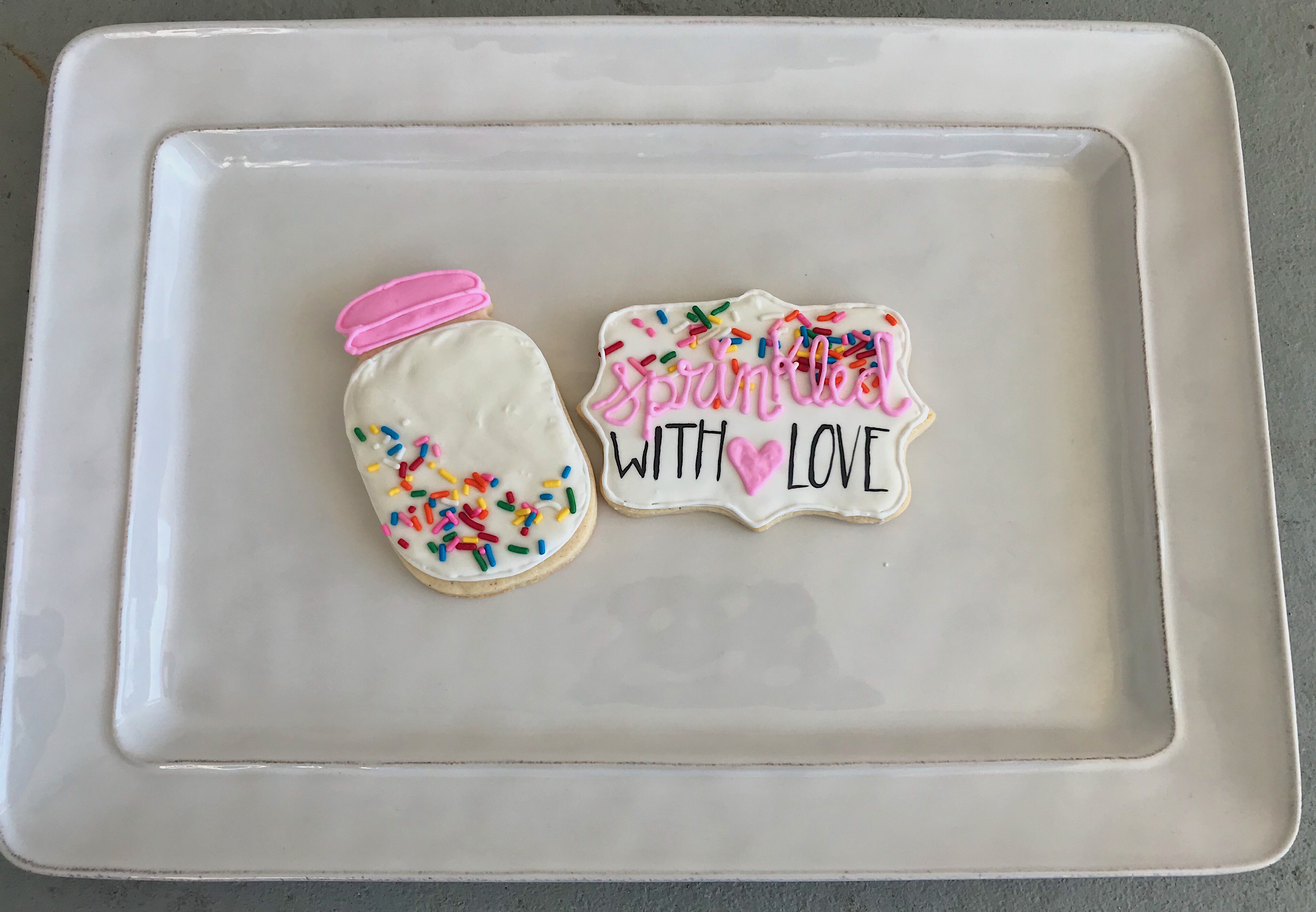 I knew that transporting the cookies from my apartment to the venue was going to be an issue because the old-recipe cookies were so fragile. I started googling solutions, and that’s when I found out that people were doing this for a living! Stumbling upon the holy grail that is Sweet Sugar Bell’s blog (if you’re just starting, I can’t emphasize enough how great and informative she is!!), I read as much as I could. I delved deep into a cookier stalking hole and began following probably close to 300 professional cookiers. I saw how incredible these cookies could be, and I decided that I wanted to be able to create something just as great. I started trying out new things, tweaking my recipes, and using meringue powder. Below are a my first official “client cookies.” They’re a hodgepodge product of the new and old recipes. Looking back at them now, they look so childish.